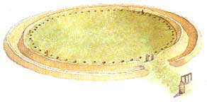 The first period of Stonehenge was basically a circular enclosure outlined by two banks and a ditch with an entrance to the northeast and a standing stone a bit away from the entrance.