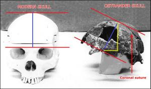 Ostrander skull to the right, allegedly from the Hueyatlaco Site. On the left a modern skull